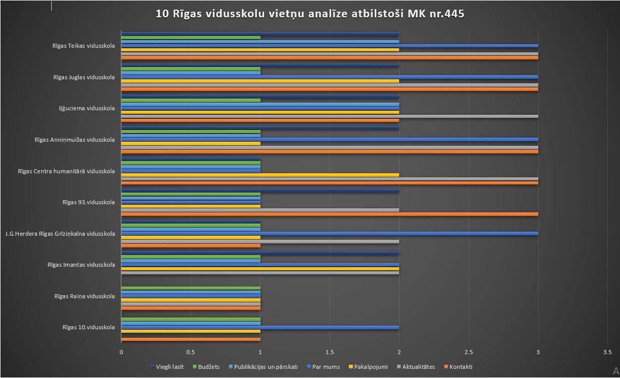 Diskutabls ir jautājums, vai visām šīm sadaļām patiesi jāatrodas vidusskolu piedāvātajās vietnēs. Dažās vietnēs šāda informācija un/vai sadaļa ir sastopama, taču dažās nav. Grafikā redzam, ka viskvalitatīvāk izstrādātā vietne (no 10 apskatītajām Rīgas skolām) ir Rīgas Teikas vidusskolai. Aiz sevis Rīgas Teikas vidusskolas vietne atstājusi Juglas vidusskolu (2.vieta) un Iļģuciema vidusskolu (3.vieta). Savukārt, visvājāk izveidotās vietnes ir Rīgas Raiņa vidusskolai un Rīgas 10.vidusskolai. Pašsaprotami, ka katrai izglītības iestādei savā vietnē ir jāpiedāvā sadaļas - "Par mums", "Kontakti" u.tml. Šīs sadaļas pārsvarā visās vietnēs bija izveidotas kvalitatīvi, taču dažu vietņu sadaļās jaušama nepabeigtības sajūta, vai tehniskas problēmas (piem., Rīgas Imantas vidusskolas vietnē sadaļu "Kontakti" nevarēja atvērt, taču Rīgas Raiņa vidusskolas vietnē sadaļa "Aktualitātes" bija pilnīgs tukšums). Tāpat jāteic, ka dažas vietnes ir vizuāli gaumīgas, acij tīkamas un informācija tajās izvietota pārskatāmi un intuitīvi atrodami, taču dažas diemžēl ir nepārskatāmas, vecmodīgas un "nesakārtotas". Secinājums - apskatot izglītības iestāžu vietnes, varam daļēji izdarīt secinājumus arī par darba organizāciju iestādē.
