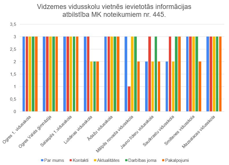 Grafikā attēlotas Vidzemes vidusskolu vietnēs ievietotās informācijas atbilstība MK noteikumiem nr. 445. Pēc attēlotās informācijas var secināt, ka liela daļa Vidzemes vidusskolu informāciju ir attēlojušas atbilstoši noteikumiem. Vislabāk visas skolas ir attēlojušas sadaļu "Par mums", kura nereti bija pirmā informācija, ko skolu vietnēs varēja redzēt. Tāpat skolas ir labi attēlojušas sadaļu "Aktualitātes", kurās uzreiz var redzēt visu aktuālo informāciju par skolās notiekošajiem pasākumiem. Vismazāk skolas ir domājušas par pakalpojumu attēlošanu, tādējādi skolēns, izvēloties skolu, nevar spriest, kādas programmas vai kursus skolās ir iespējams apgūt vispārīgā vai padziļinātā līmenī. Viszemākais rezultāts redzams Mālpils vidusskolas vietnei, kura nav korekti attēlojusi kontaktinformācijas un pakalpojumu sadaļu.